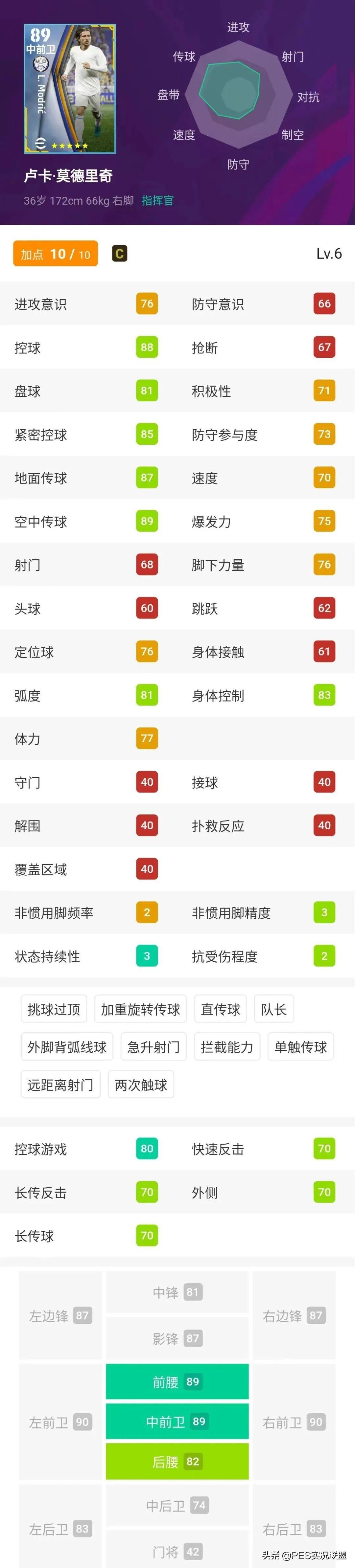 球员简析:梦幻精选莫德里奇与现实一样,拥有顶级的传控数据。天花板级别的双传,使其能够随时送出极具穿透力的手术刀传球;顶级的控球和紧密控球,如果不能控制防守球员贴身逼抢,否则很难断下皮球;86的身体平衡,也让莫德里奇拥有不错的操控性。