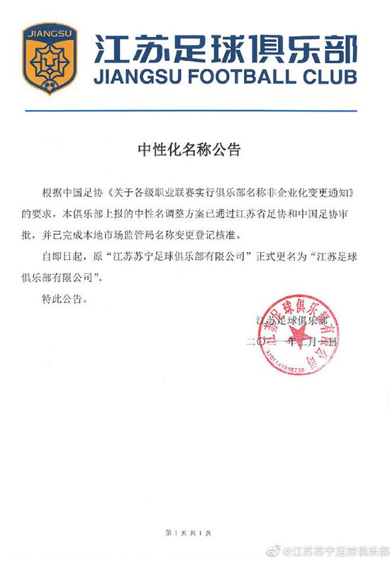 公告中表示,根据中国足协《关于各级职业联赛实行俱乐部名称非企业化变更通知》的要求,江苏苏宁俱乐部上报的中心名称调整方案已通过江苏省足协和中国足协审批,并已完成本地市场监管局名称变更登记核准。