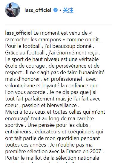 “谢谢那些在我的运动生涯中给过我鼓励的人们,以及这么些年来我经历过的俱乐部、教练、老师还有队友们。我不会忘记2007年第一次入选法国队,穿上国家队的球衣是所有职业球员的梦想,虽然岁已久远但仍不敢忘。我将在未来继续带着热情、决心还有真诚投入到未来的工作。”