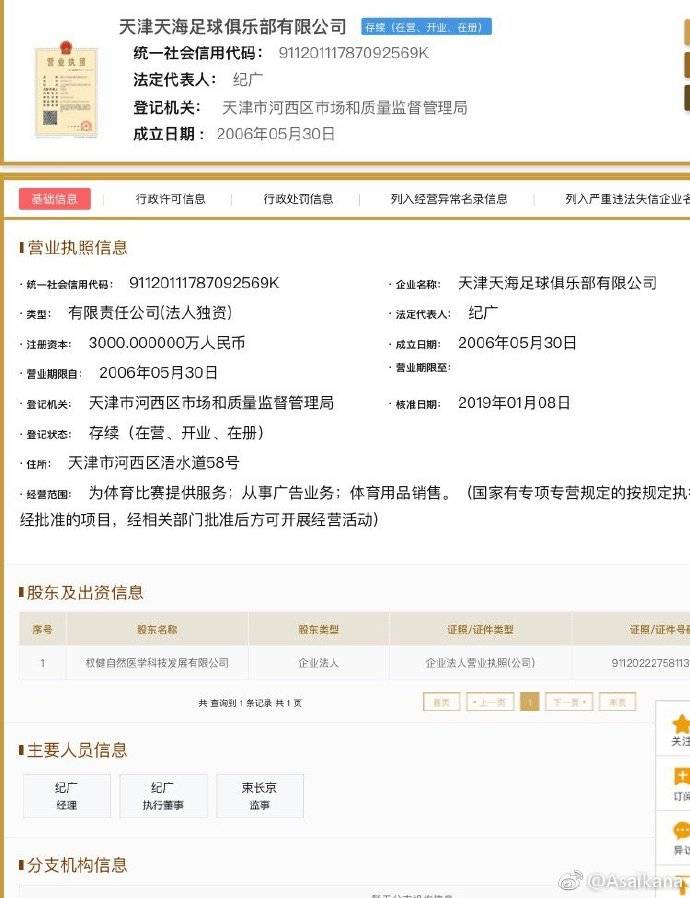此前,网络上流传权健将被托管的文件,而根据天津市河西区市场和质量监督管理局公示信息,天津权健足球俱乐部已经完成工商更名手续,将以天津天海足球俱乐部的名称,出战2019赛季的中超。