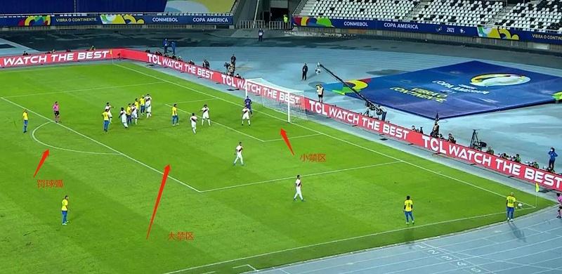 大禁区指的是罚球区,即两个球门柱向外延长16.5米,垂直于球门16.5米处的一块区域,可以通俗理解成球门区外的一块长方形区域。另外罚球区上还会有一道半弧,称为罚球弧。