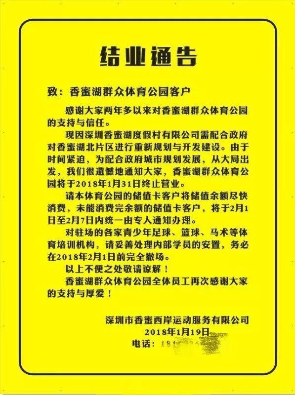 2018年1月27日,香蜜湖体育中心外围被贴上了结业通告:为配合政府城市规划发展,从大局出发,香蜜湖群众体育公园将于2018年1月31日终止营业。香蜜湖群众体育公园位于市中心区域,拥有14片人工草皮球场,一直是周边居民踢球的首选之地。球场被关停之后,周边居民只能另寻他处踢球了。