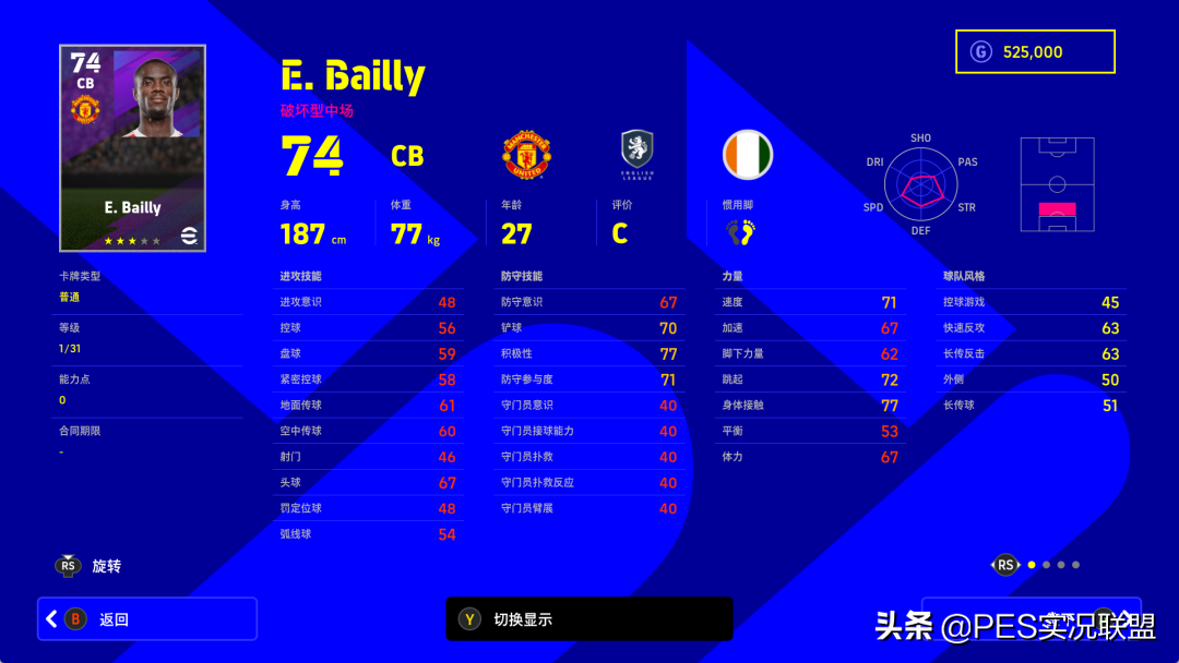 属性变化:进攻意识-9、控球-9、盘球-9、紧密控球-14、地面传球-10、空中传球-9、射门-8、头球-9、定位球-7、弧线球-7、速度-9、加速-9、脚下力量-10、跳跃-14、身体接触-11、平衡-9、体力-12、防守意识-14、铲球-14、积极性不变