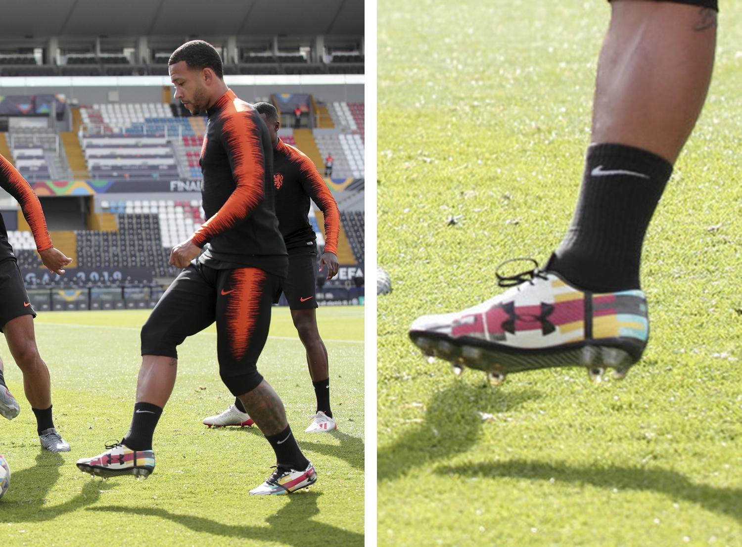 随着欧洲各国联赛的结束,欧洲国家联赛重燃战火。在备战半决赛的荷兰国家队训练场上,我们发现身为Under Armour代言人的孟菲斯·德佩换上一双全新Spotlight Pro足球鞋。从鞋面上的独特图案来看,这应该又是Under Armour为其打造的专属配色。