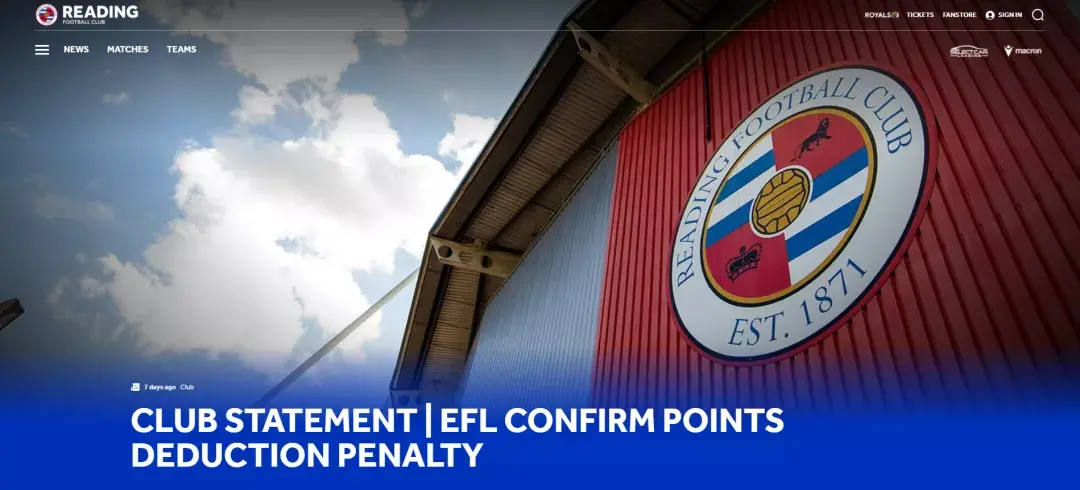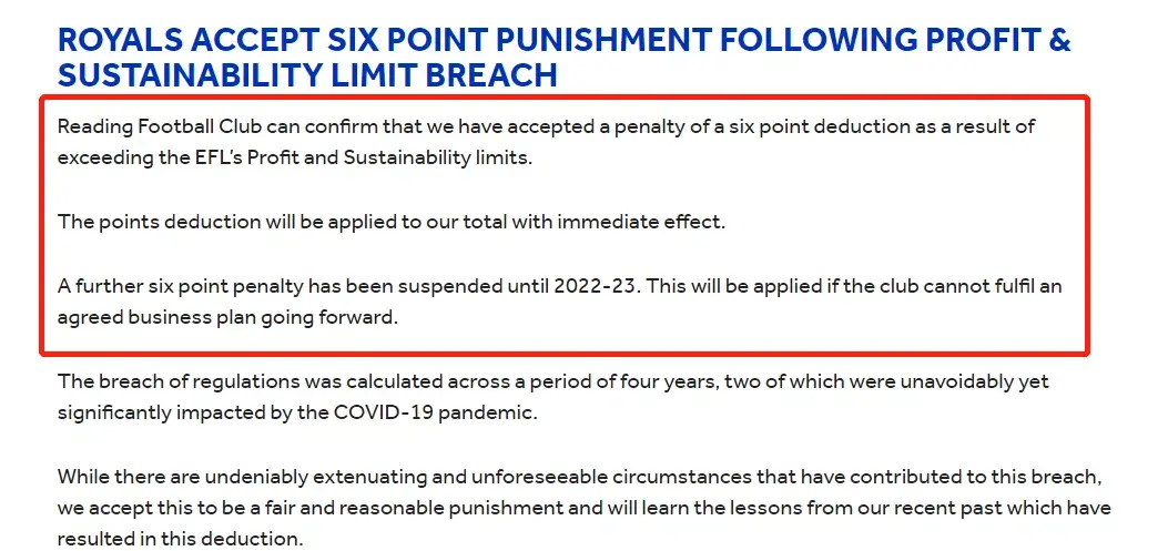 雷丁官方公告称球队已经接受了6分的扣分处罚