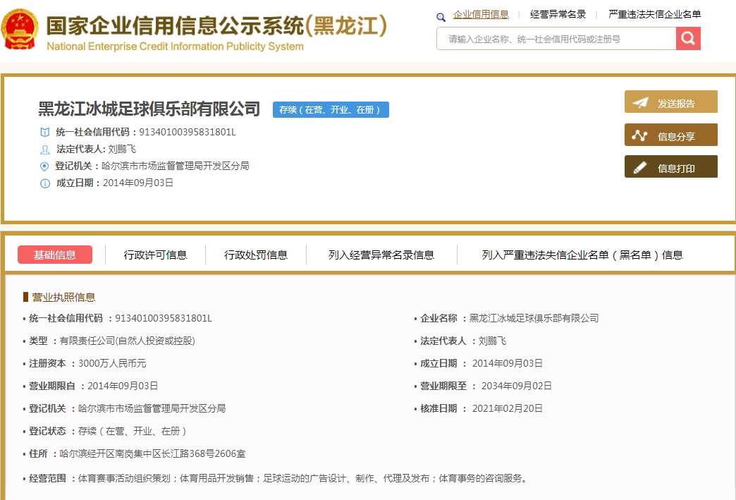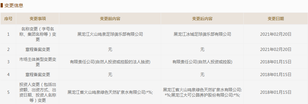 直播吧2月20日讯 国家企业信用信息公示系统显示,中甲黑龙江火山鸣泉足球俱乐部已更名为黑龙江冰城足球俱乐部有限公司。