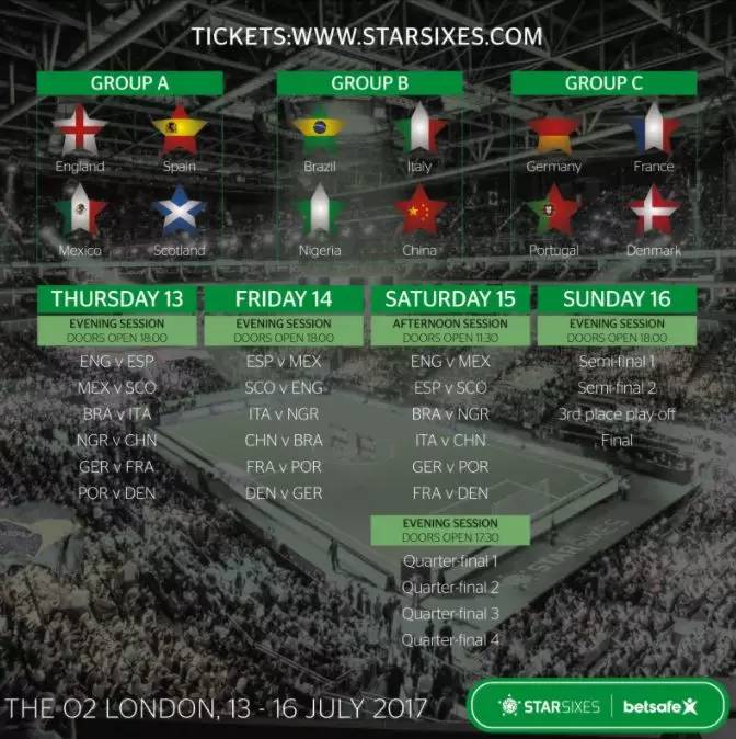 罗伯托·卡洛斯、杰拉德、巴拉克、皮耶罗、普约尔、皮雷……他们又重回绿茵场了!7月13日至7月16日,在英国伦敦的O2体育馆举行了一项全新赛事STAR SIXES“六人足球传奇元老赛”,邀请12个国家的元老球星以六人一队,在球场上PK。