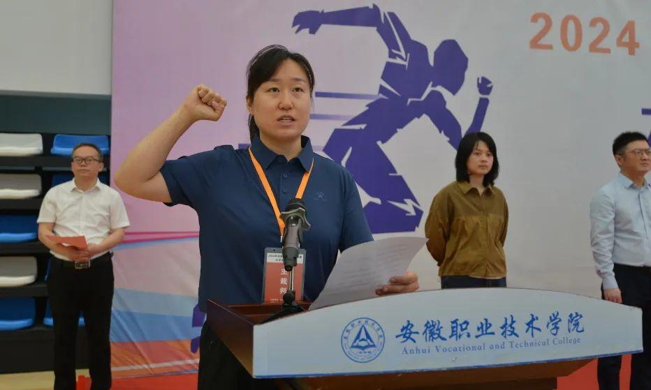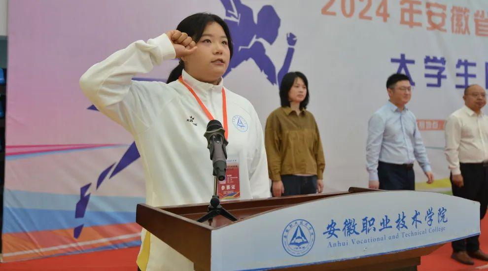 运动员代表、安徽职业技术学院学生郑秀梅宣誓,承诺以最佳状态参与比赛,遵守比赛规则,公平竞争,展现出新时代大学生的风采。裁判员代表陈若竹宣誓,承诺认真执裁,保证比赛的公正性与严肃性。★