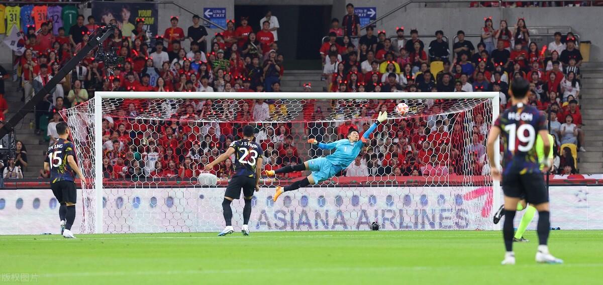 第77分钟,韩国队再次错失破门良机,右路晃开防守后传中,曹圭成头球攻门偏出后门柱。