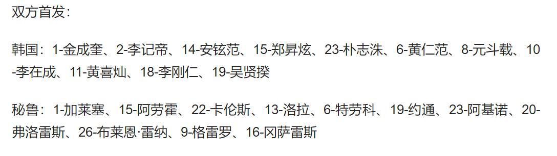 韩国首发:1-金承奎、2-李记帝(85'25-朴规现)、6-黄仁范、8-元斗载(72'5-朴镕宇)、10-李在城(62'9-曹圭成)、11-黄喜灿(85'16-黄义助)、14-安铉范、15-郑昇炫、18-李刚仁、19-吴贤揆(62'24-洪铉锡)、23-朴志洙