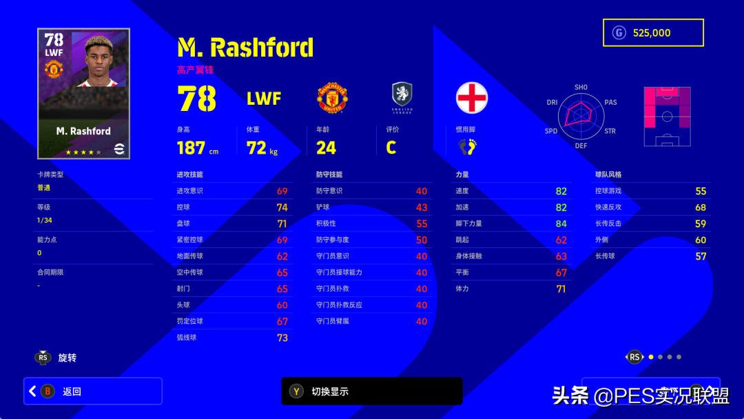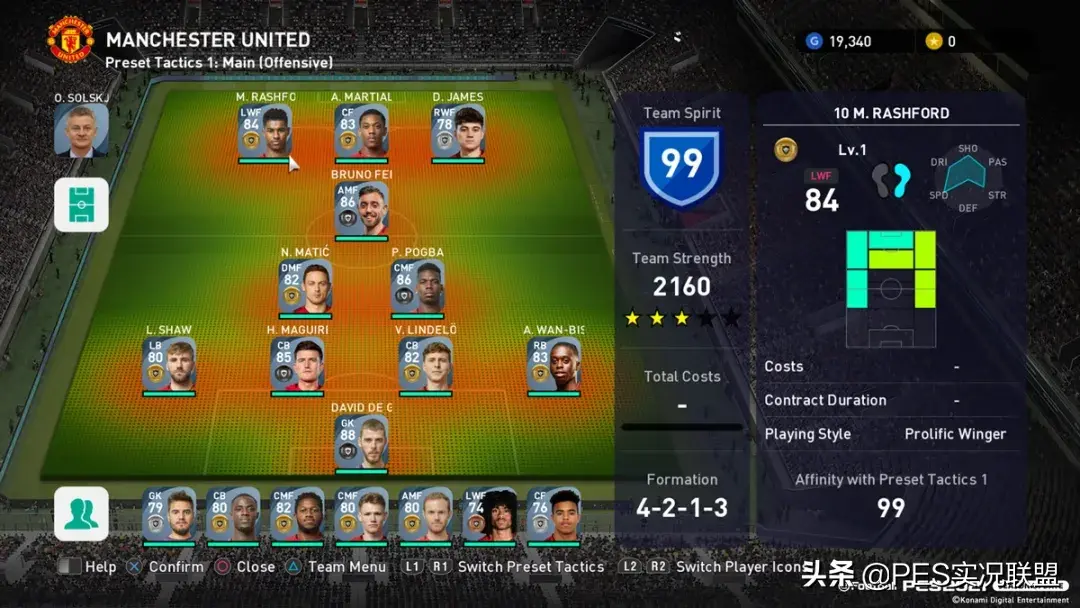 升降分析 :索尔斯克亚把中路交给了马夏尔,拉什福德的位置变成了边锋,踢法偏向于前场自由人,有点像当年C罗在曼联时候的位置。所以7月份公布的21赛季曼联阵容截图中,拉什福德的注册位置也从中锋改成了左边锋。