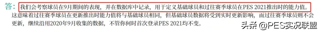 按照官方的说法,手游端的球员数据是根据球员在9月份的现实表现来评定。因此存在一个问题,就是从端游9月15号上线到手游10月份更新这一个月左右的时间,konami会不会再进行一次球员数据更新,以保证21赛季手游上线时球员的评分是反映现实中9月份的表现?会不会有球员9月份的时候评分上涨,10月份的时候又下调?如果真的这样,那手游端的囤卡就充满了不确定性因素。