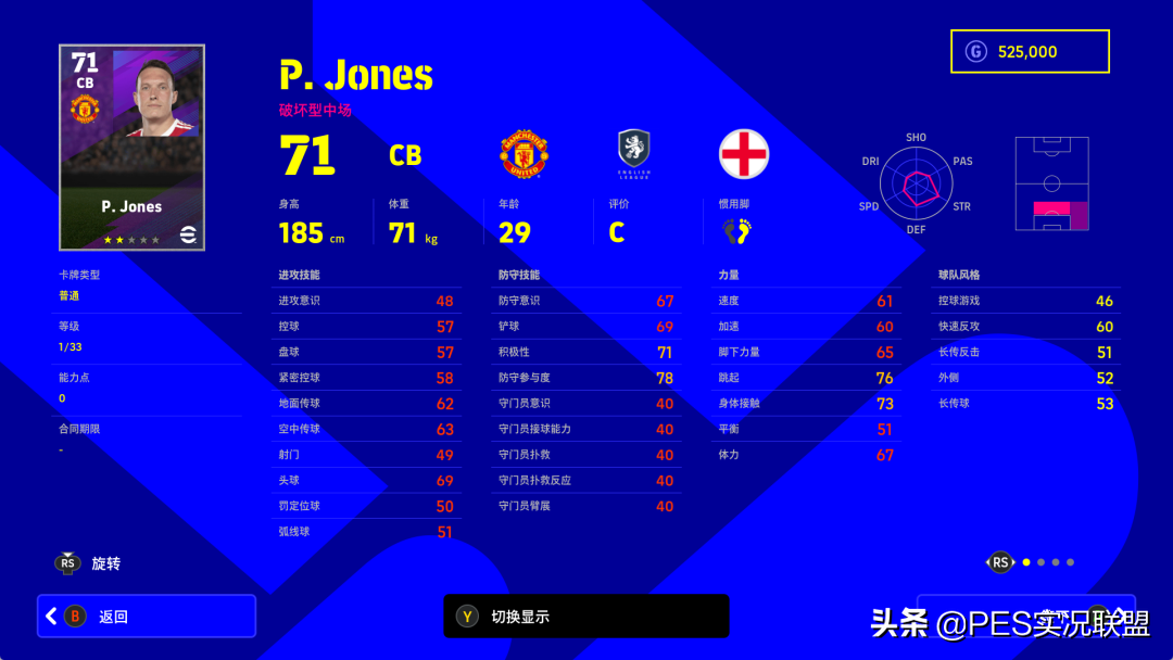 属性变化:进攻意识-9、控球-9、盘球-9、紧密控球-14、地面传球-10、空中传球-9、射门-8、头球-9、定位球-7、弧线球-7、速度-9、加速-9、脚下力量-10、跳跃-14、身体接触-11、平衡-9、体力-12、防守意识-14、铲球-14、积极性不变