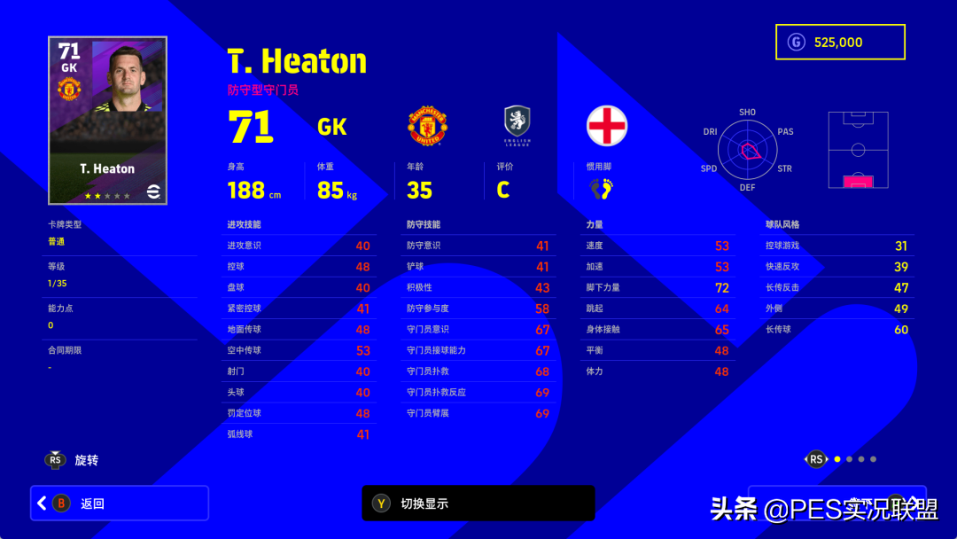属性变化:守门员意识-14、接球能力-15、扑救-14、扑救反应-14、臂展-14、进攻意识-12、控球-14、盘球-14、紧密控球-14、地面传球-14、空中传球-15、射门-12、头球-42(并非笔误)、定位球-14、弧线球-14、速度-14、加速-14、脚下力量-15、跳跃-14、身体接触-17、平衡-13、体力-13、防守意识-14、铲球-14、积极性-14