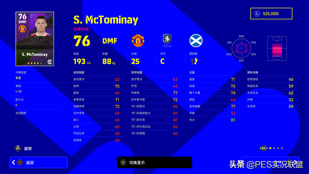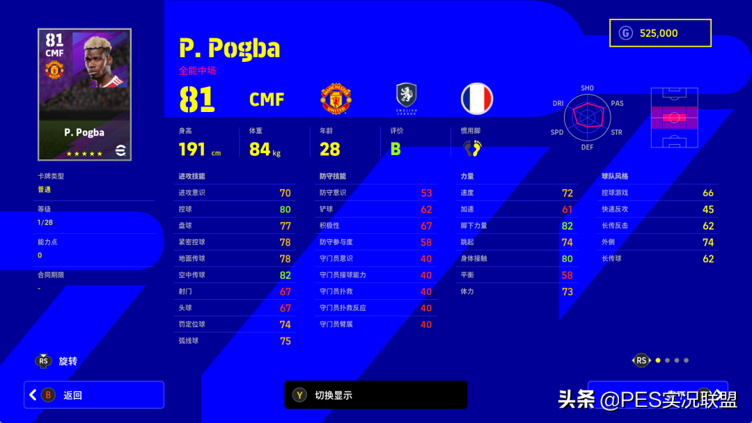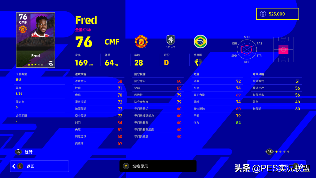 属性变化:进攻意识-10、控球-7、盘球-7、紧密控球-7、地面传球-7、空中传球-8、射门-7、头球-6、定位球-7、弧线球-7、速度-7、加速-8、脚下力量-8、跳跃-7、身体接触-8、平衡-4、体力-9、防守意识-4、铲球-6、积极性+5(并非笔误)