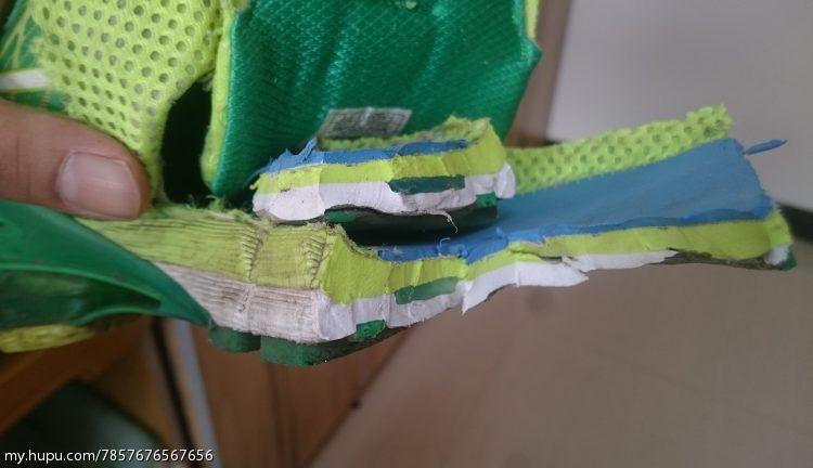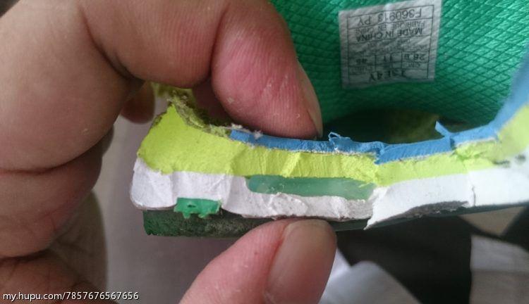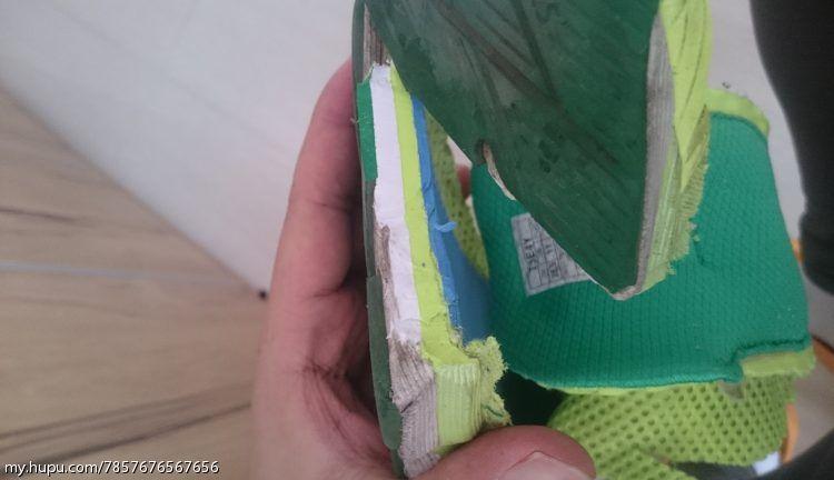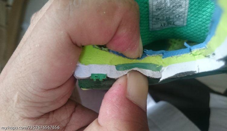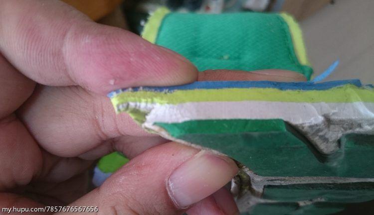 我的横切面是前掌,前掌的外侧,3层组成,蓝色的是eva,材质手感很细腻,不是很多篮球鞋替代中底布的那种eva,踩了好几个月都没变薄。。绿色的是爱世克斯特有的那个SPEVA。密度比较高,但是很弹,白色的就是普通evA,,最关键的是外地橡胶,划重点! 这双鞋前掌外底橡胶密度明显比后掌低了非常多,而且你用手掐,能明显感觉到很弹!就像缓震胶一样!所以这双鞋前掌磨损极快,但优点是,可以近一步起到能量反馈的目的