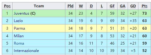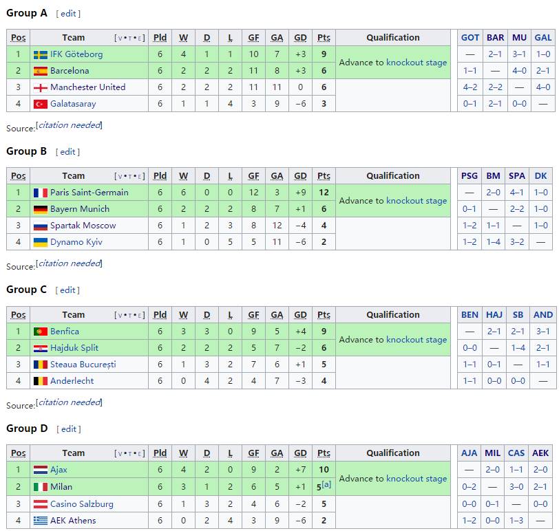 1994/95赛季欧冠小组赛战果,当时是两分制