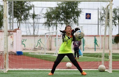 甘肃省榆中县中连川小学的学生赵璐婷在进行守门训练(2019年9月3日摄)。 新华社记者 马宁 摄