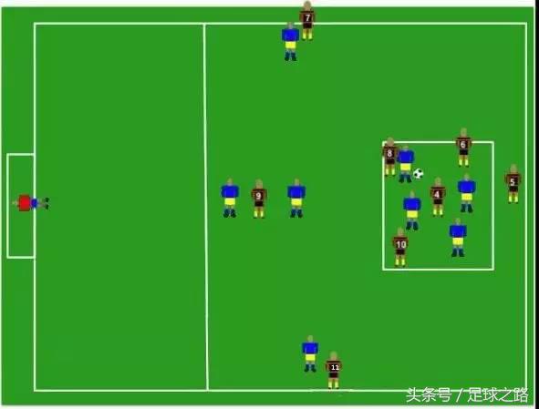 整个训练在足球场半场进行,在中线附近用标志盘划出一个15*15的区域;