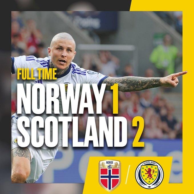 赛前挪威官方公布了哈兰德因脚踝伤势无缘出战的消息,不过他们在客场先声夺人,开场3分钟便由阿龙-冬纳姆破门,苏格兰则是在第13分钟由队长麦金点射破门。第20分钟拉尔森为挪威再度超出比分,但第33分钟苏格兰凭借厄斯蒂高的乌龙球再度扳平,半场结束后两队战成2-2平。