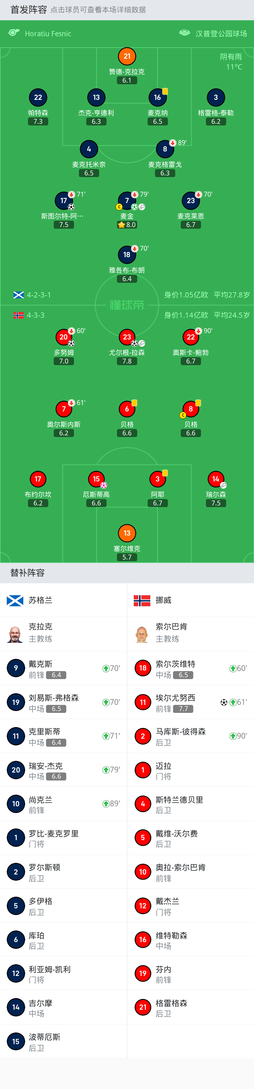 挪威首发(4-4-2):1-尼兰德 / 14-莱尔森、4-斯特兰德贝里、15-厄斯蒂加德、5-梅林 / 6-伯格、16-奥尔斯内斯、17-索尔巴肯、10-厄德高 / 9-哈兰德、19-索尔洛特