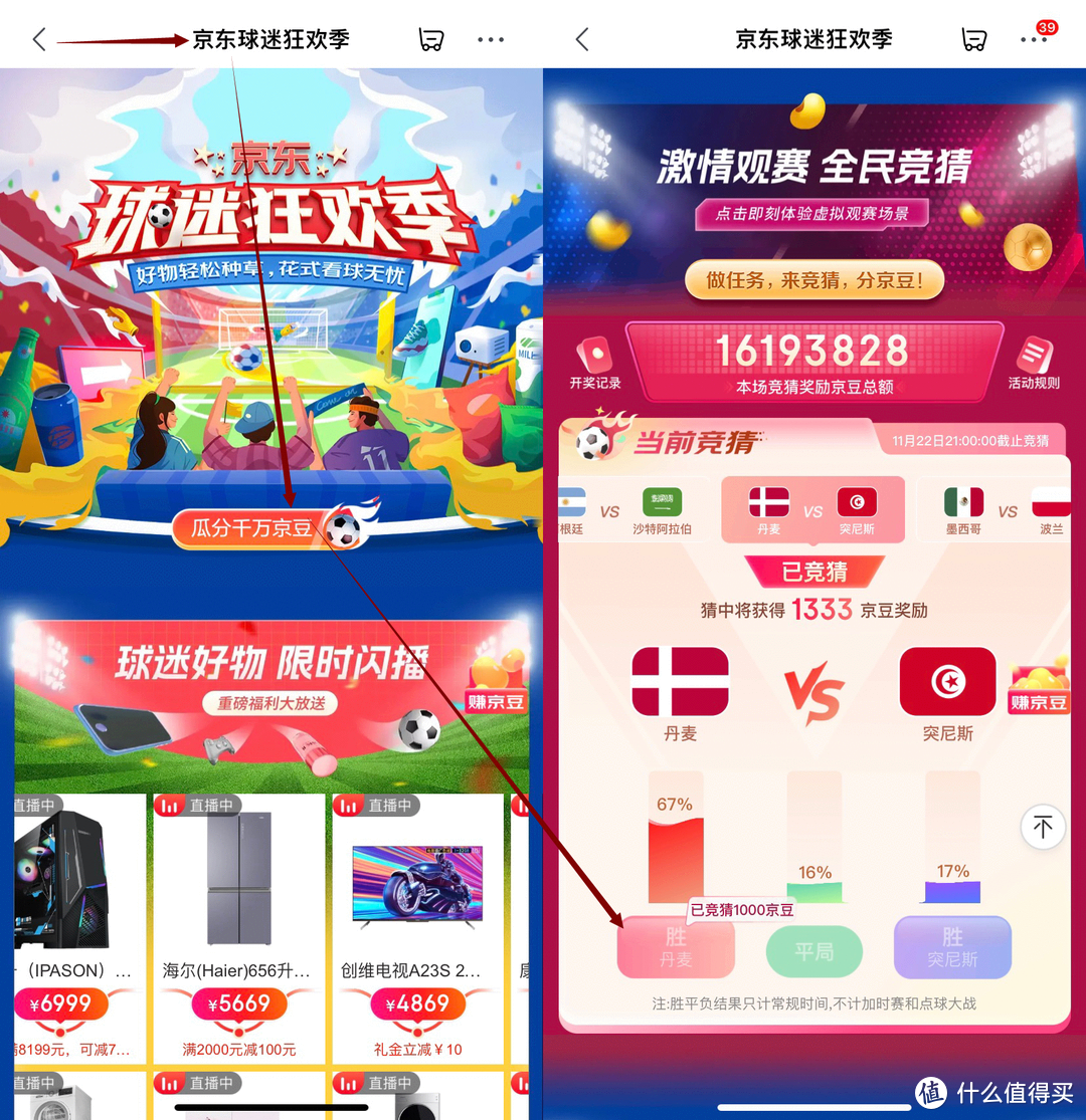 路径:打开京东app——搜索球迷狂欢节——点击超燃扫视竞猜瓜分千万京豆,进入竞猜界面。竞猜需要投入京豆。猜中获得的京豆会在24小时内发放到账户中,京豆有效期为180天。