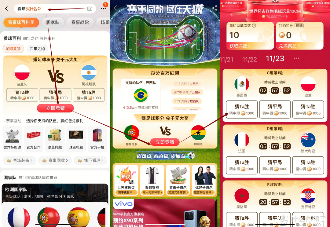 路径:打开淘宝app——搜索看球买什么——点击立即竞猜——点击立即竞猜,进入竞猜界面。每天有10次助威机会,做任务可以获得更多助威机会。助威的球队获胜后可以的得到积分,积分可以用来兑换实物商品。