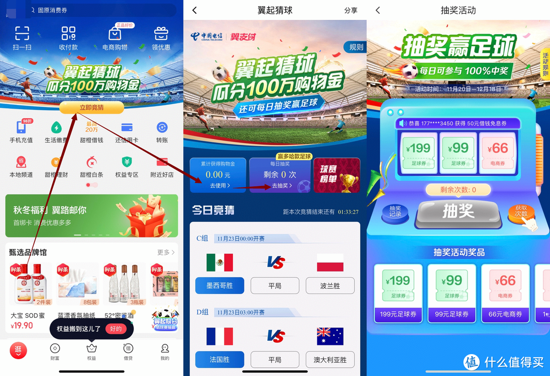 路径:打开翼支付app——点击立即竞猜参与活动,猜中可以获得购物金,小组赛(11月20日—12月3日)每天瓜分18888元购物金,淘汰赛(12月4日—12月18日)每天瓜分68888元购物金。购物金会在比赛结果公布后三个工作日内发放到账户中,购物金有效期为7天。