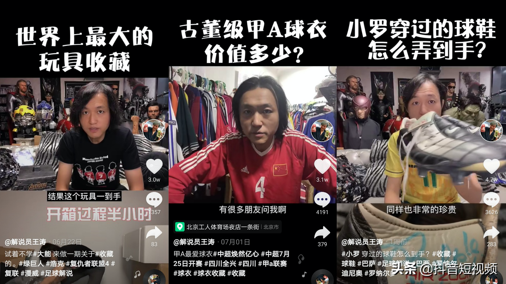 在王涛的抖音里,除了看到他极具风格的解说、演绎,还能看到他惊人的个人收藏:球鞋、球衣、玩具…… 在抖音除了让他更直接的面对受众以外,他仿佛在这里找到解放天性的方式。