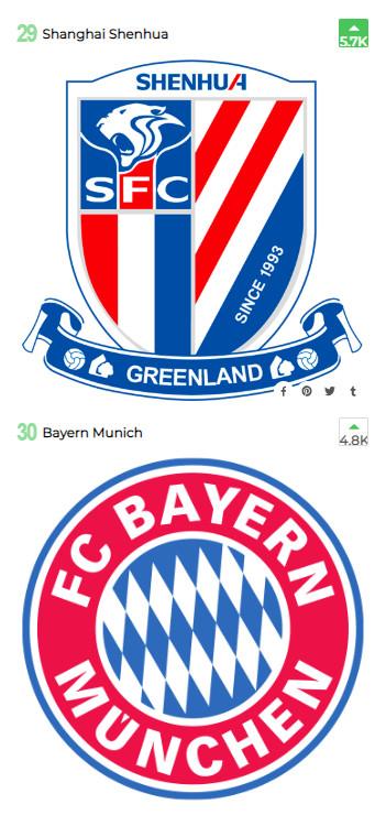 在TOP50的排行榜上,申花一路从第49名,现在已经蹿升至第29名,再往上都是大家耳熟能详的俱乐部了,而排在他身后的还包括了拜仁慕尼黑、多特蒙德等在世界极富盛名的俱乐部。