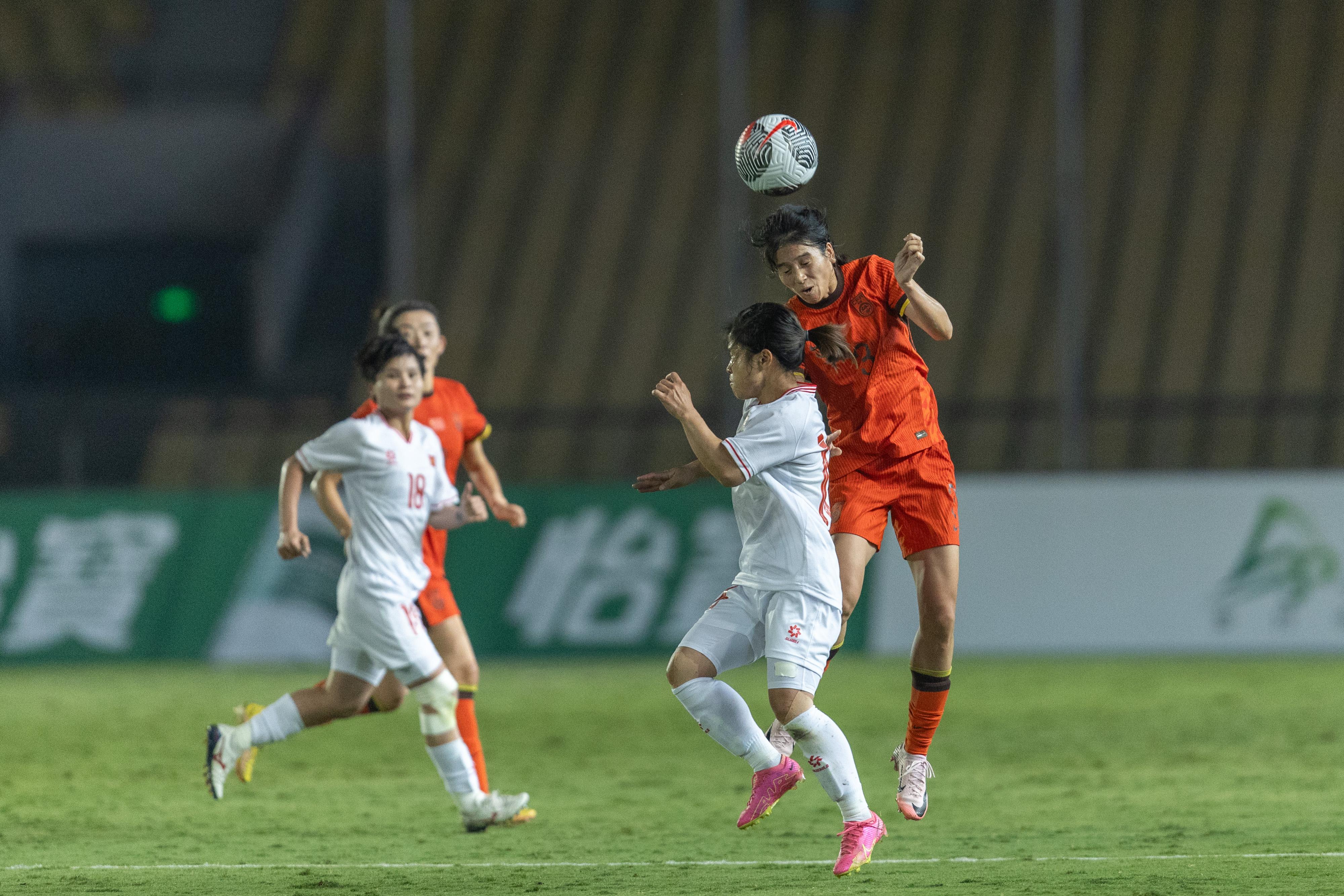 10月29日,中国队球员陈巧珠(右上)在比赛中争顶头球。 新华社记者 黄伟 摄