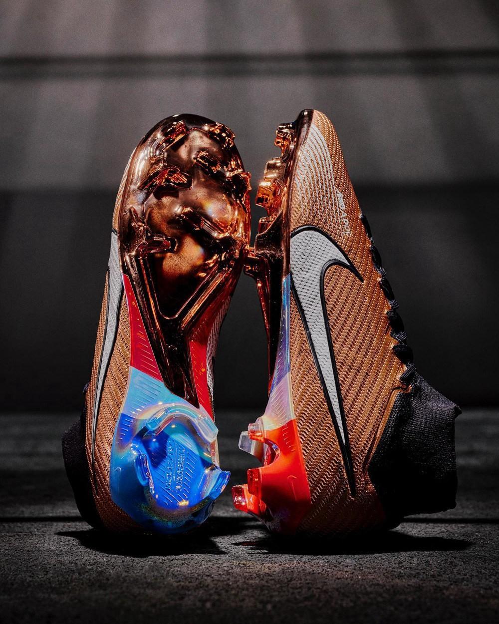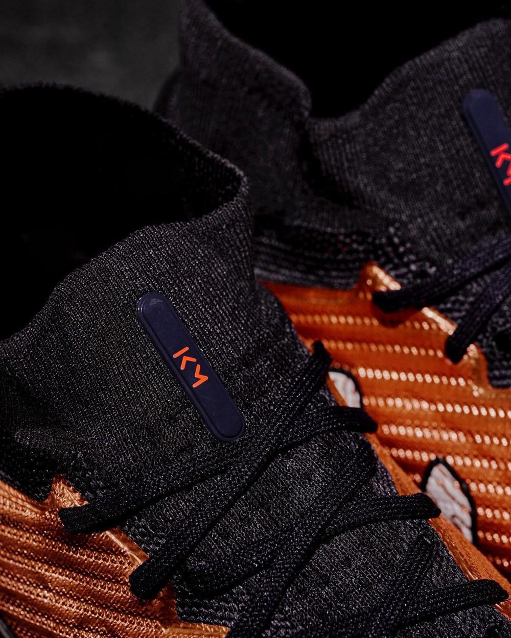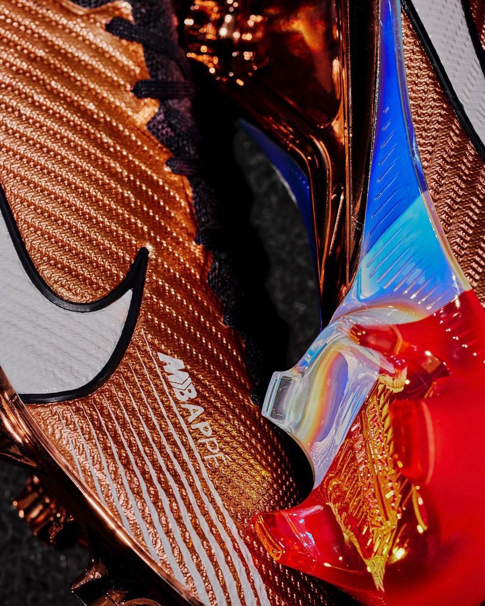 这款新战靴有着与耐克为世界杯打造的“Generation Pack”套装相同的金属铜色外观,并在大底后跟位置加入代表法国国旗的蓝白红三色涂层,同时鞋头位置带有融入Mercurial Logo的“MBAPPE”字样,并且鞋舌标签也改为这位法国球星的名字缩写“KM”。此外,这款战靴的鞋垫上也带有法国国旗图案。虽然最终姆巴佩未能捧起金杯,但获得世界杯金靴也让这款个人专属战靴显得意义非凡。