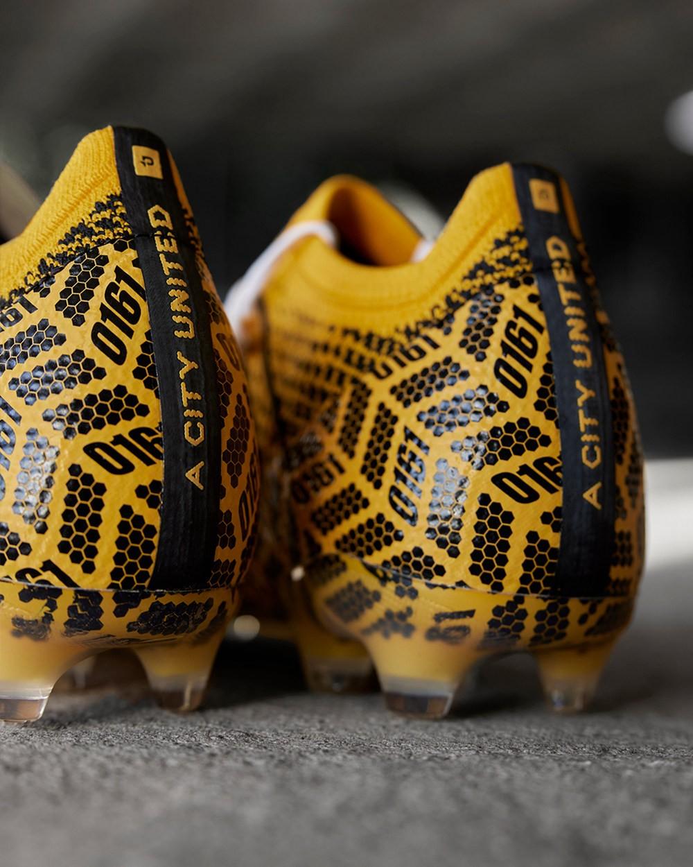 作为双方合作打造的MCR “A City United”联名系列中的明星产品,这款特别版战靴将曼彻斯特电话区号0161作为设计核心元素,橘色鞋面上加入由象征着蜂巢的黑色六边形图形所组成的图案以及“0161”字样。“A City United”的口号则出现在球鞋后跟上,搭配的白色鞋带在鞋面衬托下格外醒目。