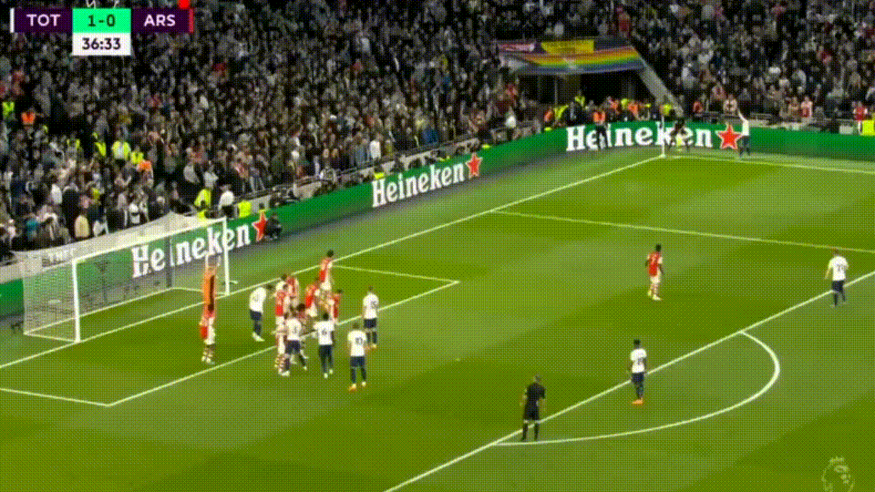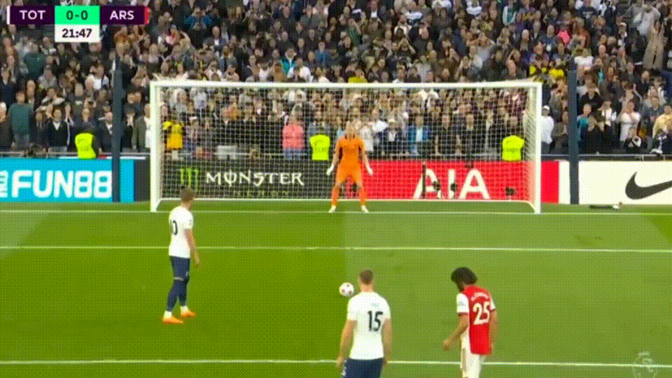 门将判断失误扑错方向,凯恩操刀命中1-0,为热刺取得领先。