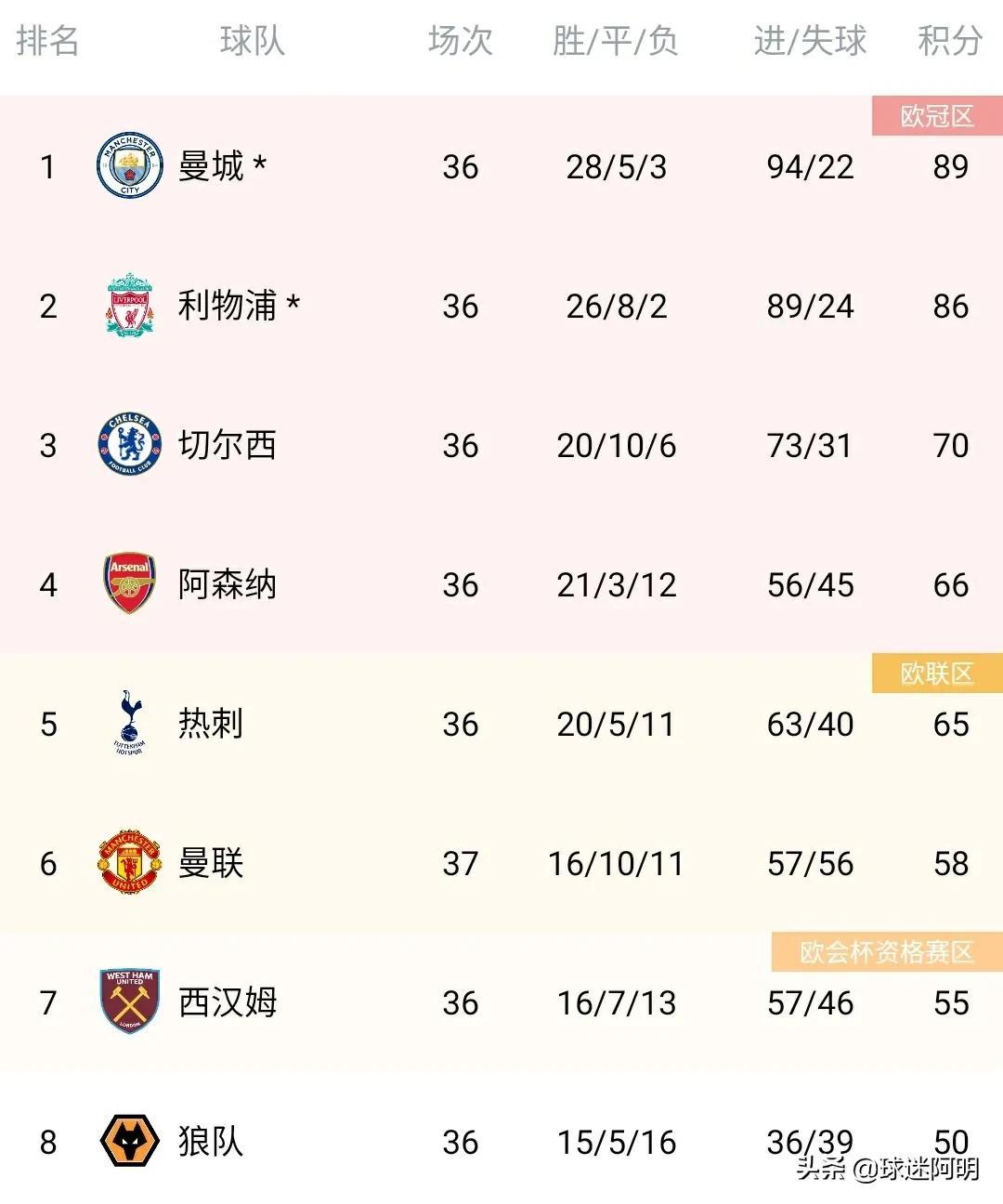 第4名,阿森纳积66分,余下2轮分别对阵:纽卡斯尔联,埃弗顿。