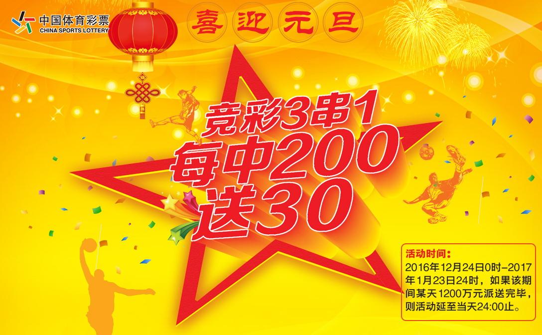 为回报广大彩友对竞彩游戏的支持与厚爱,广东省体育彩票中心于2016年12月24日起,开展“玩转竞彩足球3串1,中200送30”赠票活动,赠票总额1200万元!