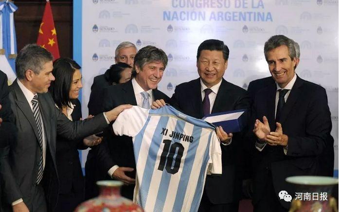 2014年7月,习近平出访阿根廷时,获赠了一件阿根廷顶级足球俱乐部博卡青年队10号队服。此前阿根廷国会已向习近平赠送了阿根廷国家队10号队服,于是他幽默地问道:“转会费多少?”