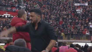 本赛季意甲第15轮的一场较量,升班马贝内文托主场迎战刚换帅的AC米兰,此前14轮联赛贝内文托遭遇了全败。这是刚成为AC米兰新主帅的加图索执教球队的首场比赛,在比赛中,凭借博纳文图拉和卡利尼奇的进球,AC米兰两度领先,但在下半场,AC米兰后卫罗马尼奥利两黄变一红被罚下,场上少一人后,场边的加图索用手指示意,球队变阵为4-4-1。