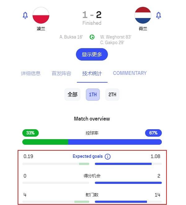 其实荷兰队在比赛的前半段,优势已经是非常巨大。上半场预期进球1.08比0.19占据绝对优势,射门数更是14比4领先,只是射正数仅仅才3比2。