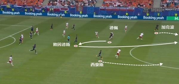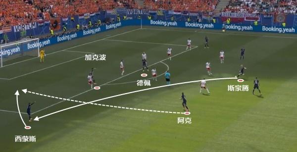 这一次的进攻中,就是斯豪腾将球转移到弱侧,空位的西蒙斯接球时,后排的阿克快速前插,形成中路加克波和德佩两人抢点的机会。