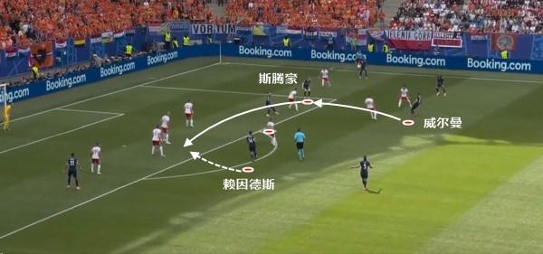值得注意的是,中场的维纳尔杜姆快速前插禁区肋部,韦霍斯特向后点走,让波兰中卫出现了走位上的错误。