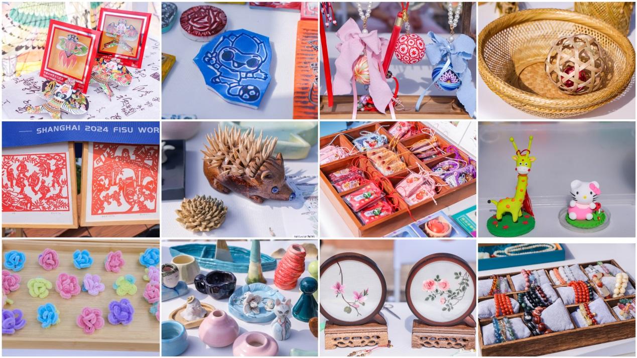 来自上海市、松江区的非遗项目中式盘扣、苏绣、压金丝嵌宝工艺、上海剪纸、叶榭竹编工艺、松江刻漆技艺、手鞠制作技艺等13个主题展台,为世界大学生们展示东方艺术魅力。