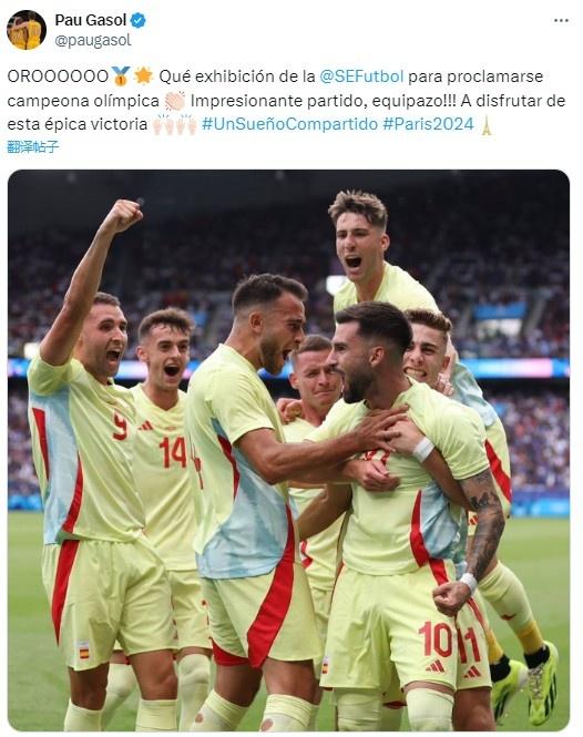 比赛结束后,他又点评道:“金牌!西班牙国奥队踢得多棒啊!比赛太精彩了,伟大的团队!享受这场史诗般的胜利吧!”