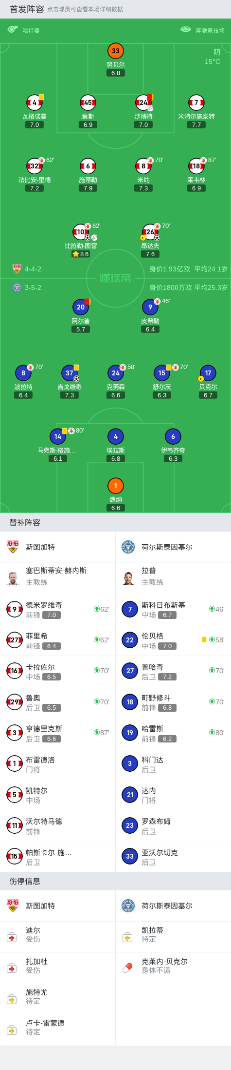 在德国足球顶级联赛第8轮的较量中,斯图加特坐镇主场迎战荷尔斯泰因基尔。上半场,昂达夫在比拉勒-图雷的助攻下成功破门,为球队取得领先。下半场,比拉勒-图雷外围一脚世界波破门将比分扩大。沙博特与对方发生争执,吃到第二张黄牌被罚下。吉戈维奇补射破门扳回一分;阿尔普两黄变一红被罚下。最终斯图加特主场2-1战胜荷尔斯泰因基尔。