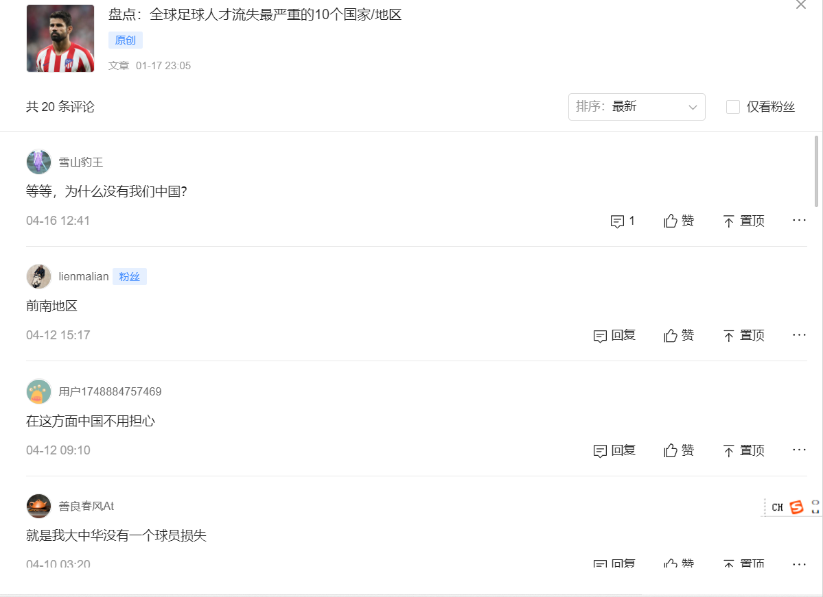 此前下沉的一篇文章里,收到过这样的评论:中国有哪些足球人才流失?