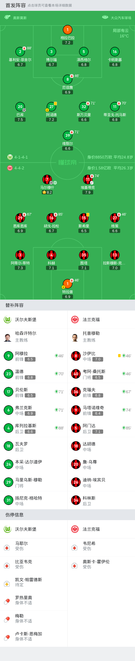 在德国足球顶级联赛第3轮的比赛中,沃尔夫斯堡主场迎战法兰克福。上半场,维默尔头球攻门顶偏,马尔穆什过掉门将推射破门。下半场,埃基蒂克远射被扑,马尔穆什补射再次被挡出,阿蒂尔-蒂特头球攻门击中立柱,巴库远射破门扳平比分,马尔穆什点射建功,最终,沃尔夫斯堡1-2法兰克福。
