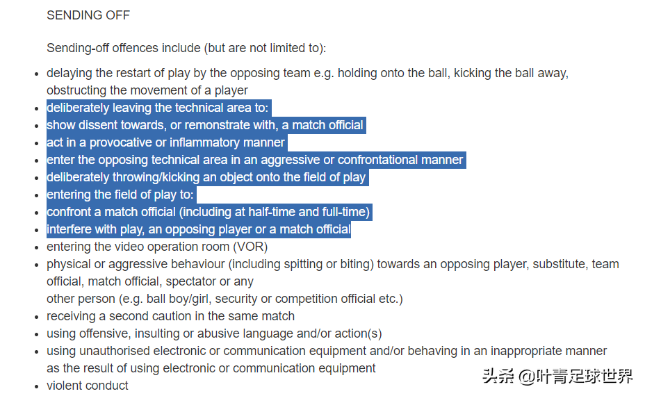 其二,汪泉伸脚绊倒对方球员,这就更严重了。按照FIFA竞赛规则,这一行为属于“罚令出场的犯规(Sending-Off Offences)”。这条规则中明确写道:故意离开技术区域,干扰比赛的进行,干扰对方球员或者比赛官员,就属于“罚令出场的犯规”。