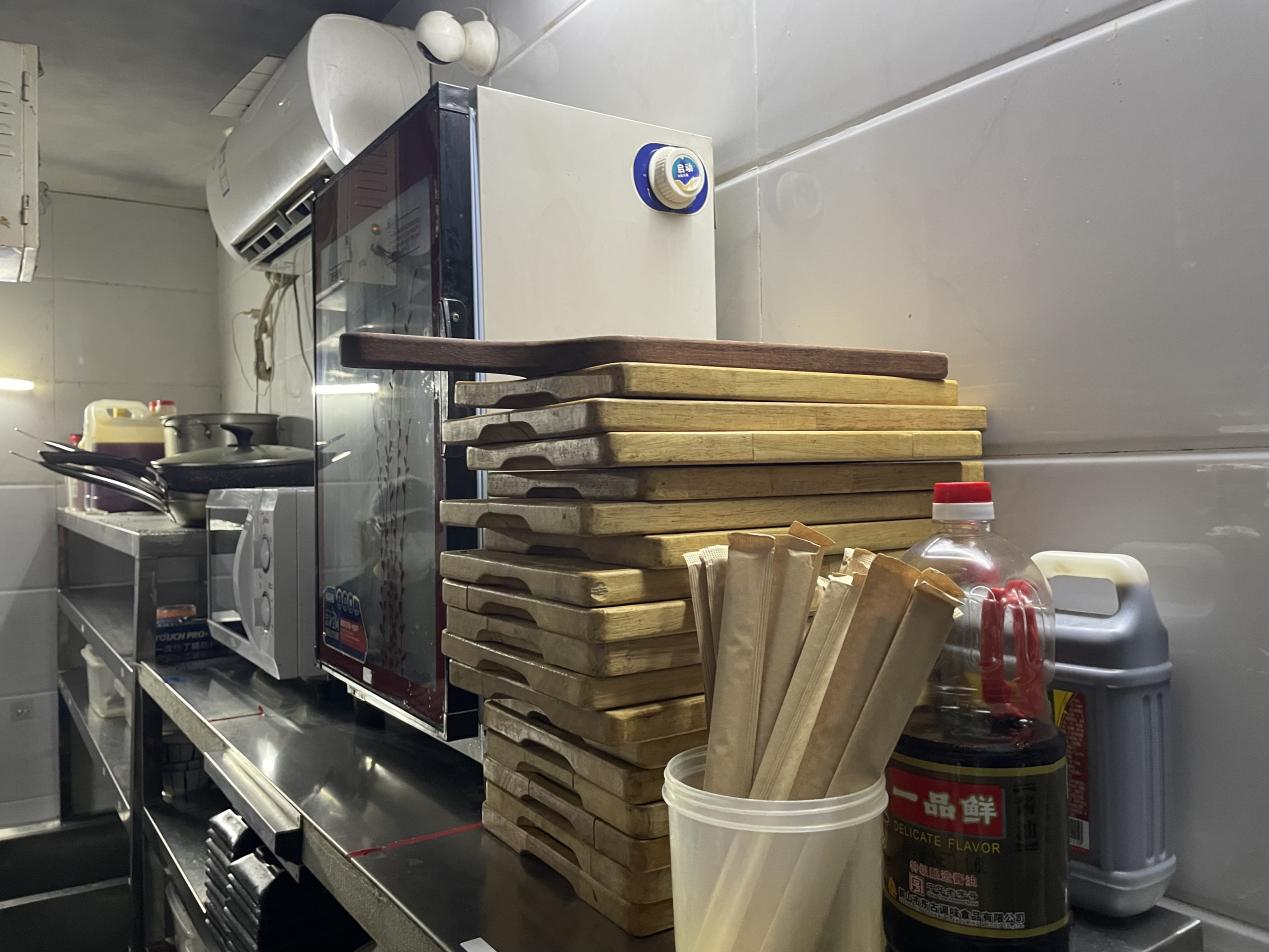 在餐具存放区域,执法人员发现消毒柜的摆放位置较高,店员消毒餐具时操作较为困难,且部分清洗后的餐具摆放在收纳架上,直接暴露在空气中。执法人员建议将消毒柜放置在易于操作的区域,以提高餐具清洗消毒频率,并表示封闭保存餐具应存放在封闭的餐具柜或消毒柜中,要求门店尽快整改。