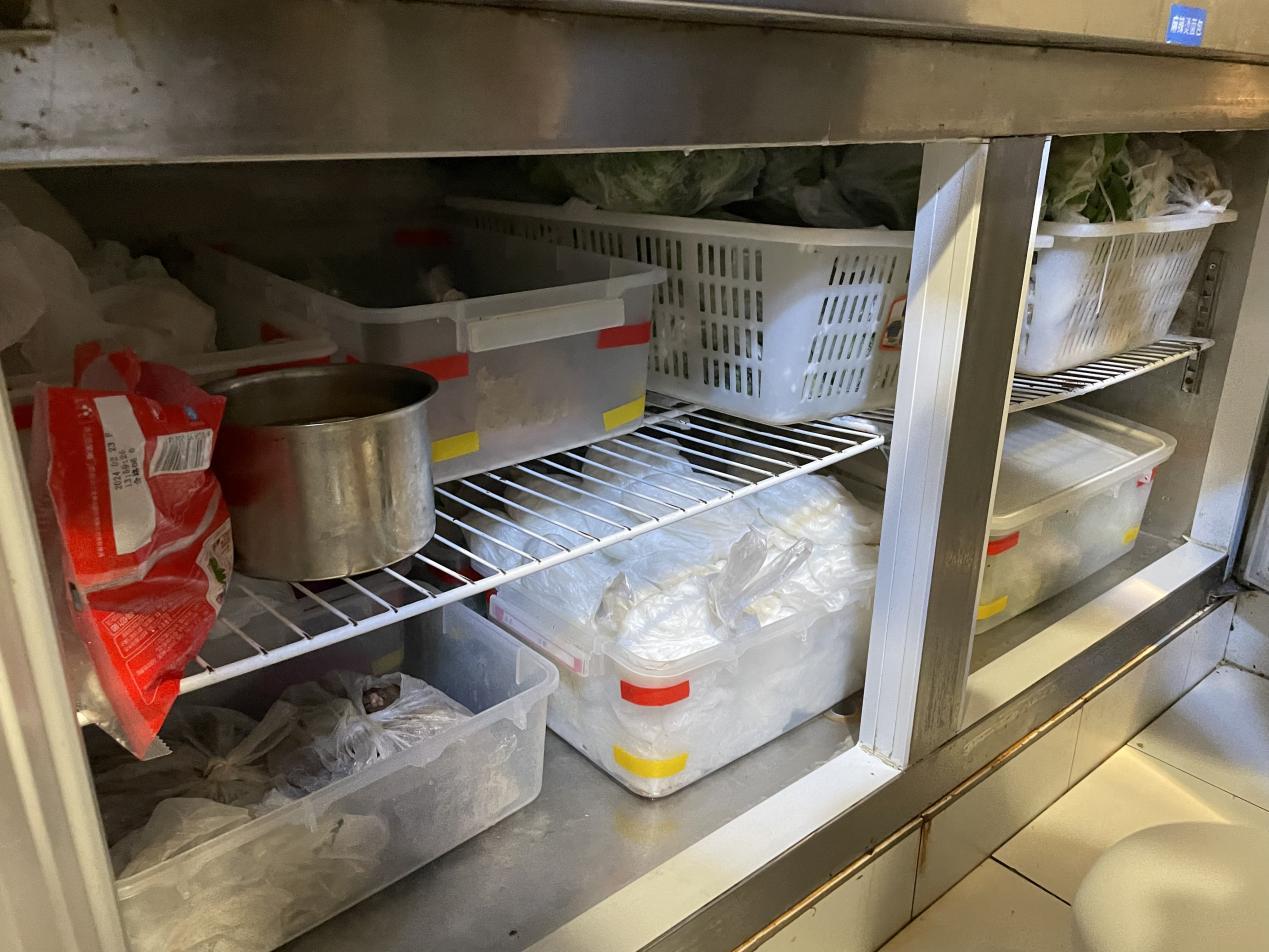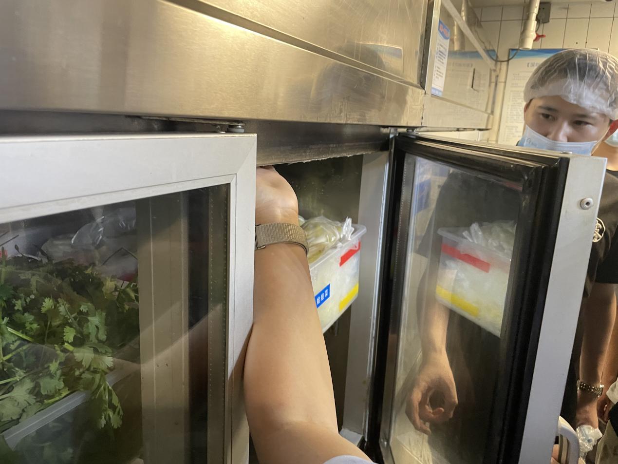 在检查冰箱内食材时,执法人员发现冷藏冰箱内的河粉未张贴进货信息和保质期等标签标识。执法人员表示,粉制品保质期短且食品安全风险高,要求门店提供食材索证索票记录。另一处储存蔬菜、腌制肉类的冰箱温度较高,易导致食材变质,不符合食材储存要求。执法人员要求门店对冷藏冰箱及时进行温度调整和检修。