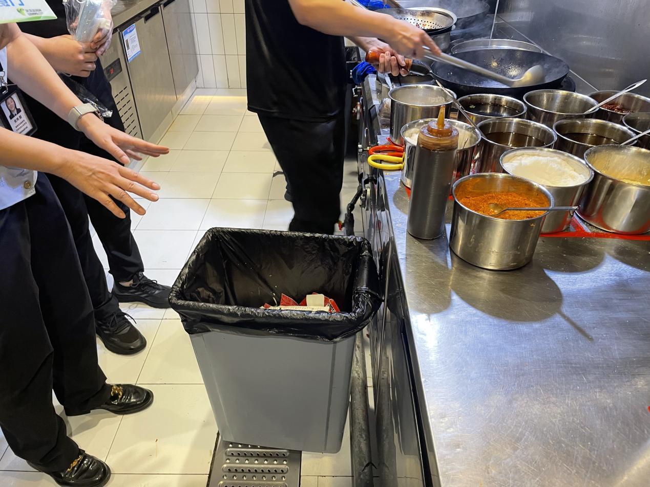 进入后厨,执法人员首先发现两处垃圾桶均未加盖,要求更换为脚踏式加盖垃圾桶。